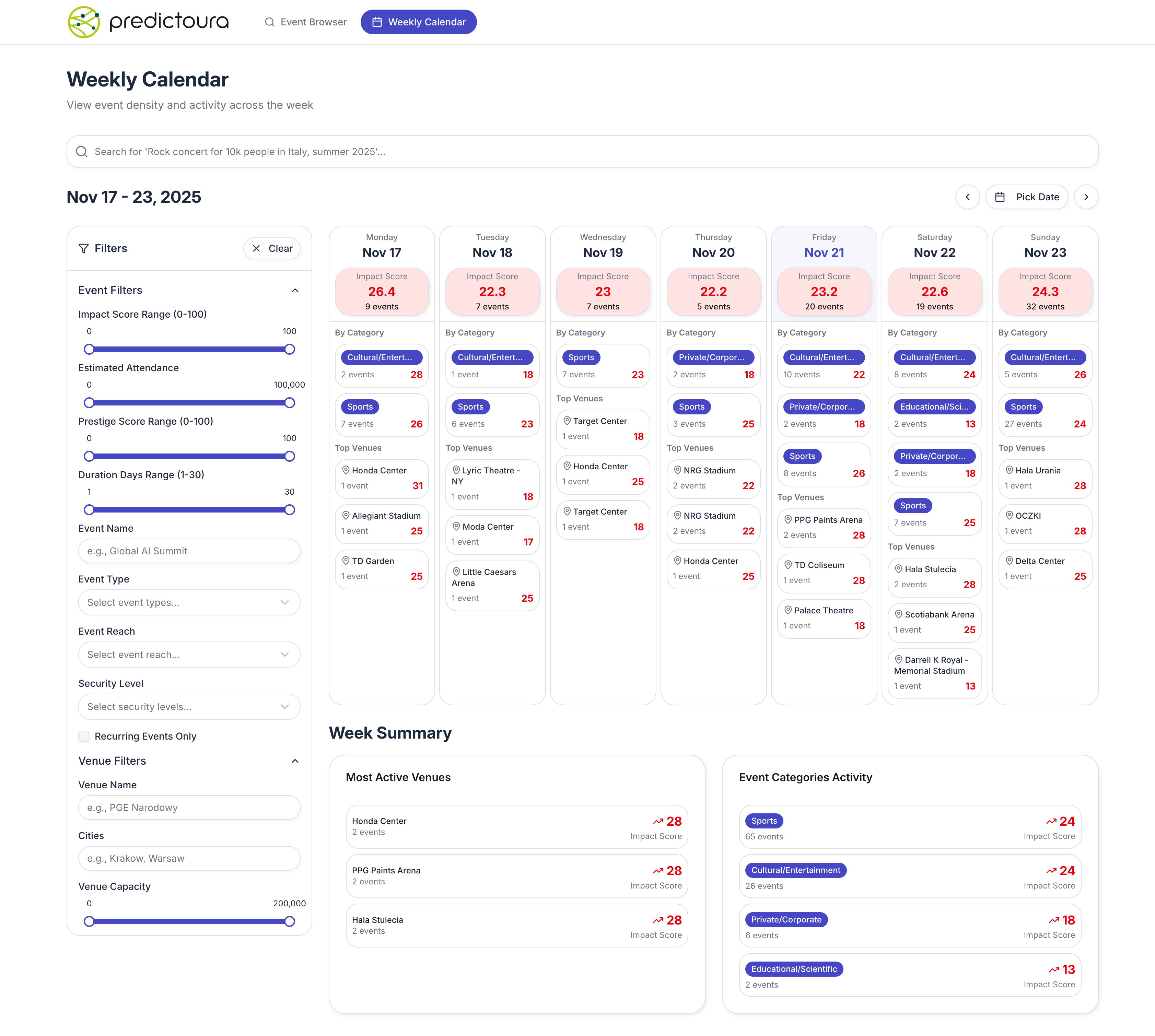 - Wochenkalender mit täglichen Impact-Scores, Kategorieaktivitäts-Breakdown, Top-3-Venues jeden Tag und Wochenzusammenfassung mit Ranking der aktivsten Standorte