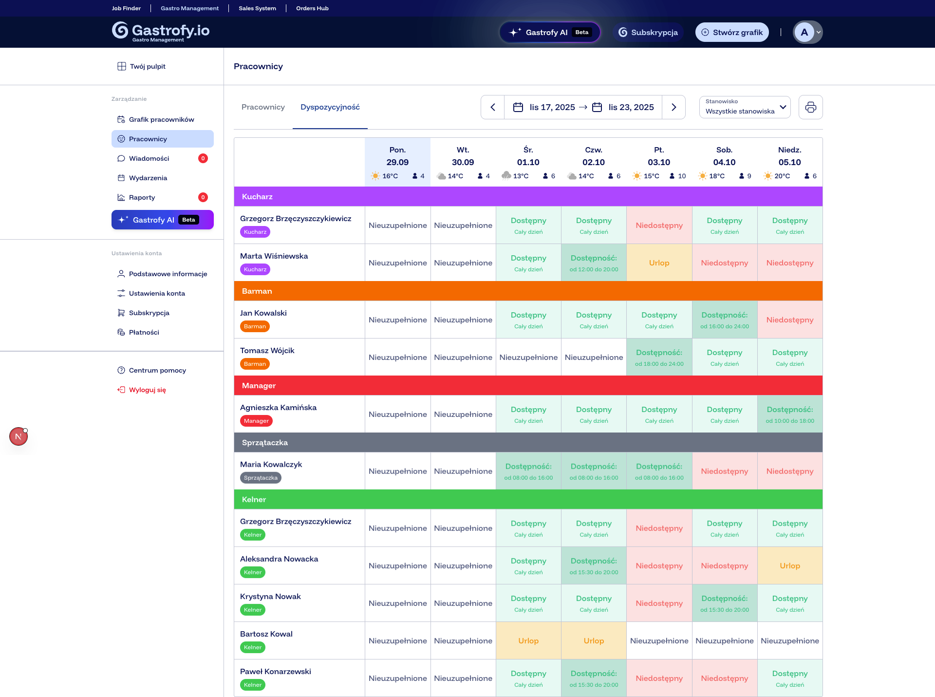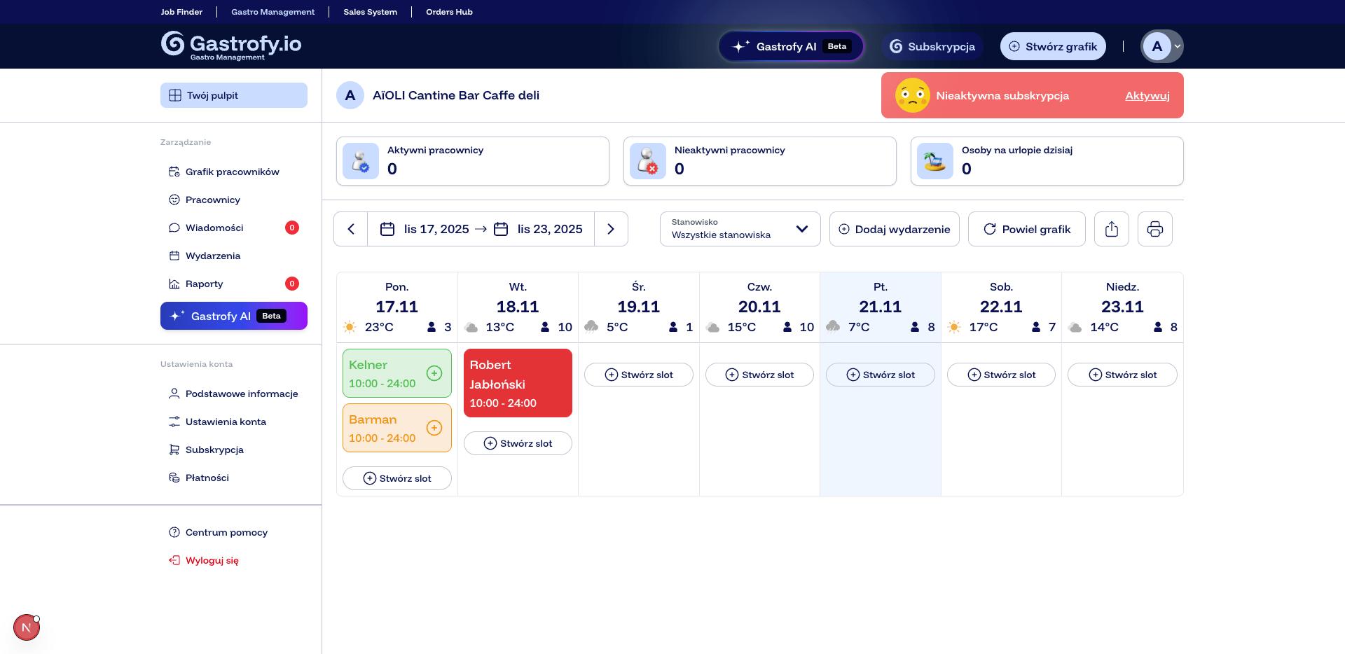 Gastrofy ist eine moderne Plattform, die das Management von Gastronomiebetrieben mit dem Arbeitsmarkt verbindet. Entwickelt für Restaurantbesitzer, Manager und Fachkräfte der HoReCa-Branche, vereint die Anwendung fortschrittliche Werkzeuge für Personal- und Finanzverwaltung mit einem intelligenten Rekrutierungsmodul, das auf proprietären KI-Lösungen basiert.