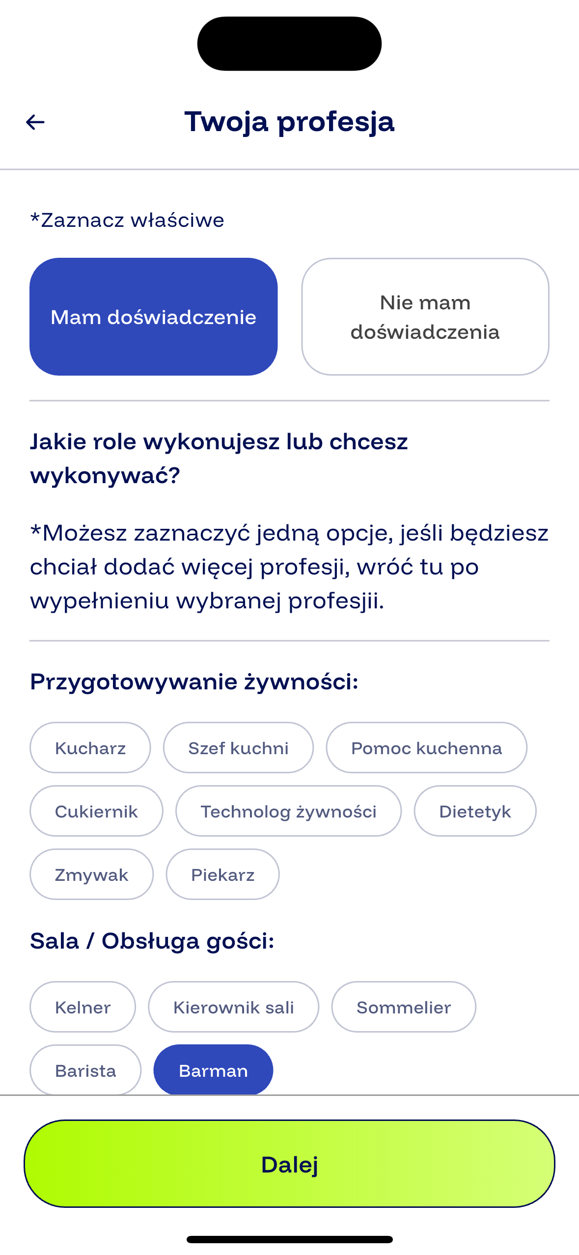 Die Berufsformular-Ansicht ist die erste Ansicht, in der der Benutzer Informationen über seine Erfahrung eingibt.