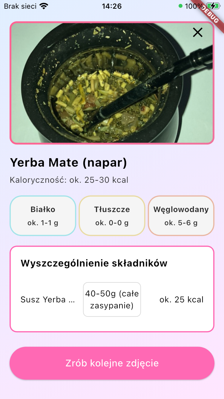 Auf dem Bildschirm ist eine Vorschau der Mahlzeit mit einer Analyse der Kalorien, Makronährstoffe sowie einer Liste erkannter Zutaten zu sehen.