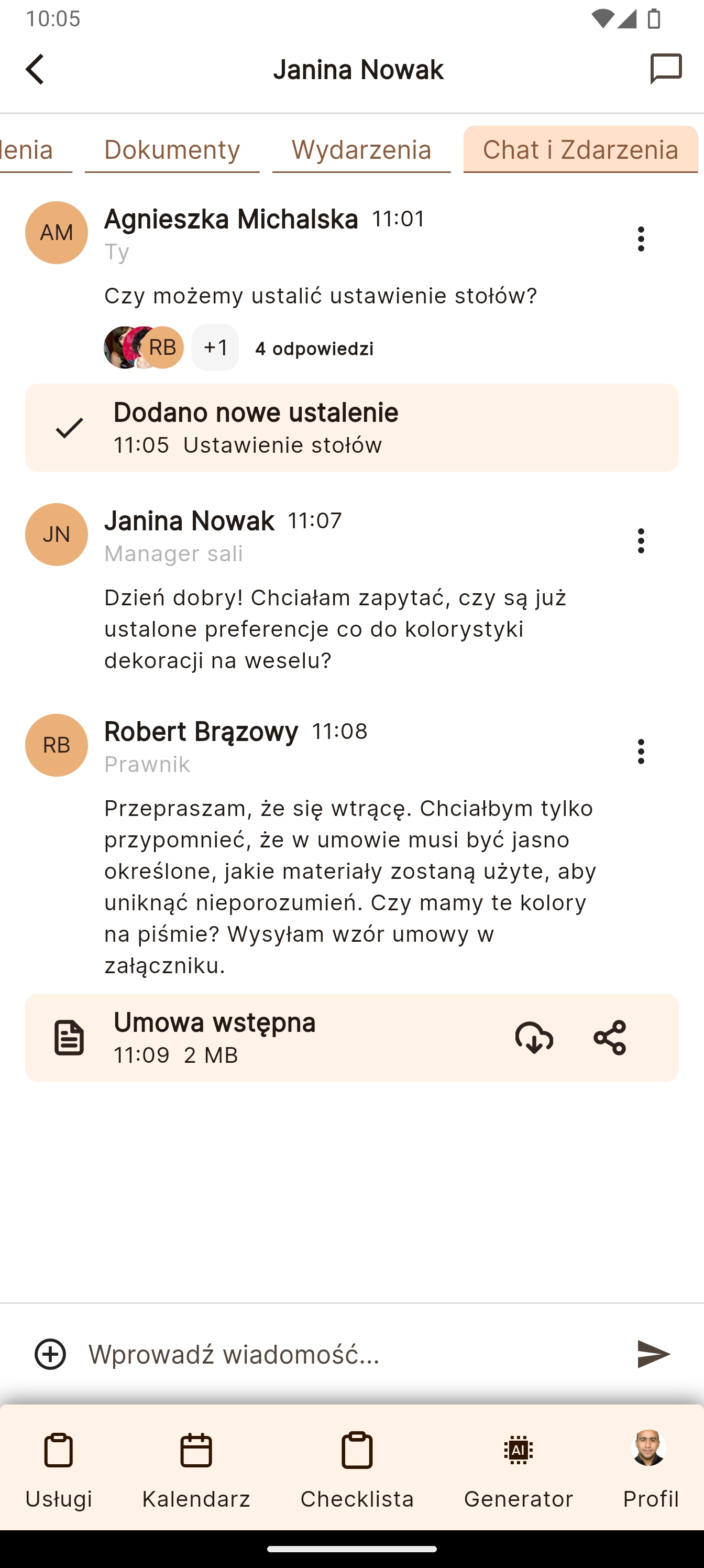 Wbudowany czat w czasie rzeczywistym umożliwia bezpośrednią komunikację między użytkownikami, przesyłanie wiadomości, plików, ustaleń i terminów.