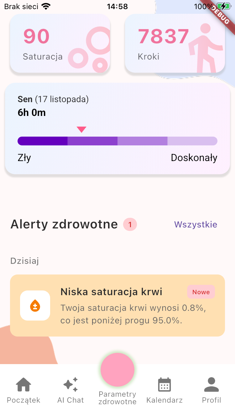 Na ekranie widoczny jest panel zdrowia z saturacją, krokami, snem i alertami o nieprawidłowych wynikach.