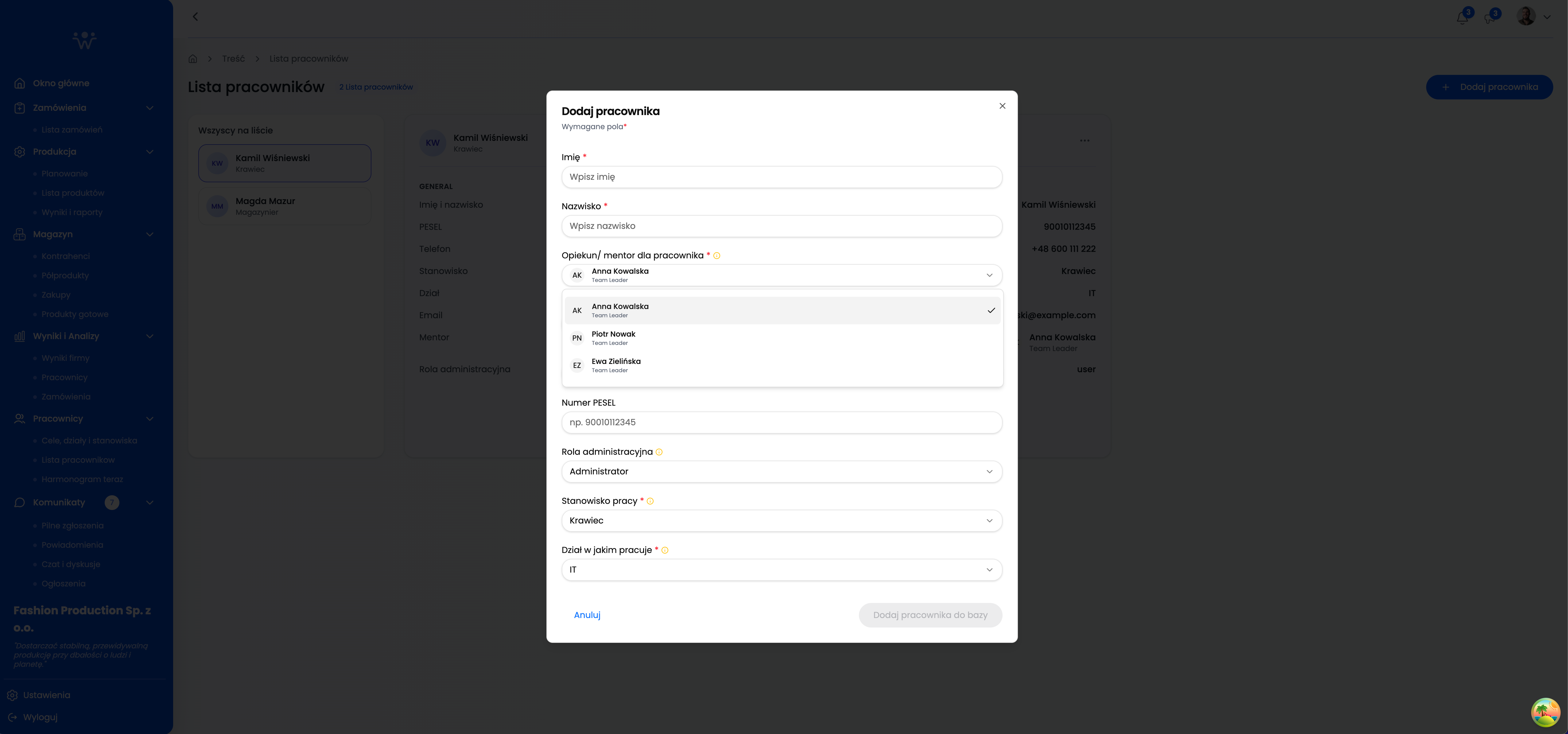 Formularz pozwalający na szybkie dodanie nowego pracownika do systemu. Umożliwia przypisanie mentora, roli administracyjnej, stanowiska oraz działu, zapewniając spójną strukturę zarządzania personelem już na etapie onboardingu.