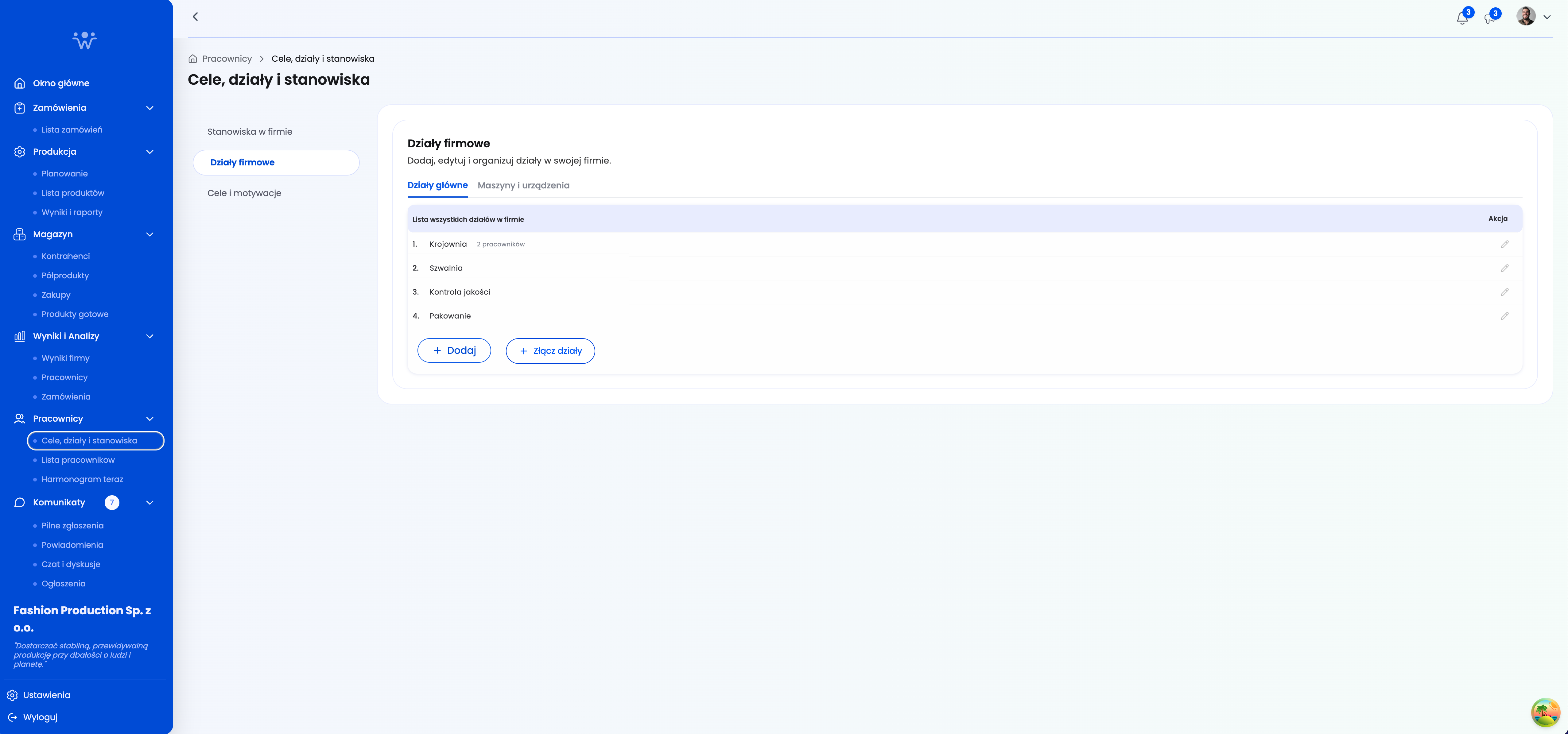 Widok umożliwiający zarządzanie strukturą organizacyjną firmy. Użytkownik może dodawać, edytować oraz scalać działy firmowe, a także definiować stanowiska pracy i powiązane z nimi role. Centralne miejsce do porządkowania organizacji zespołu.