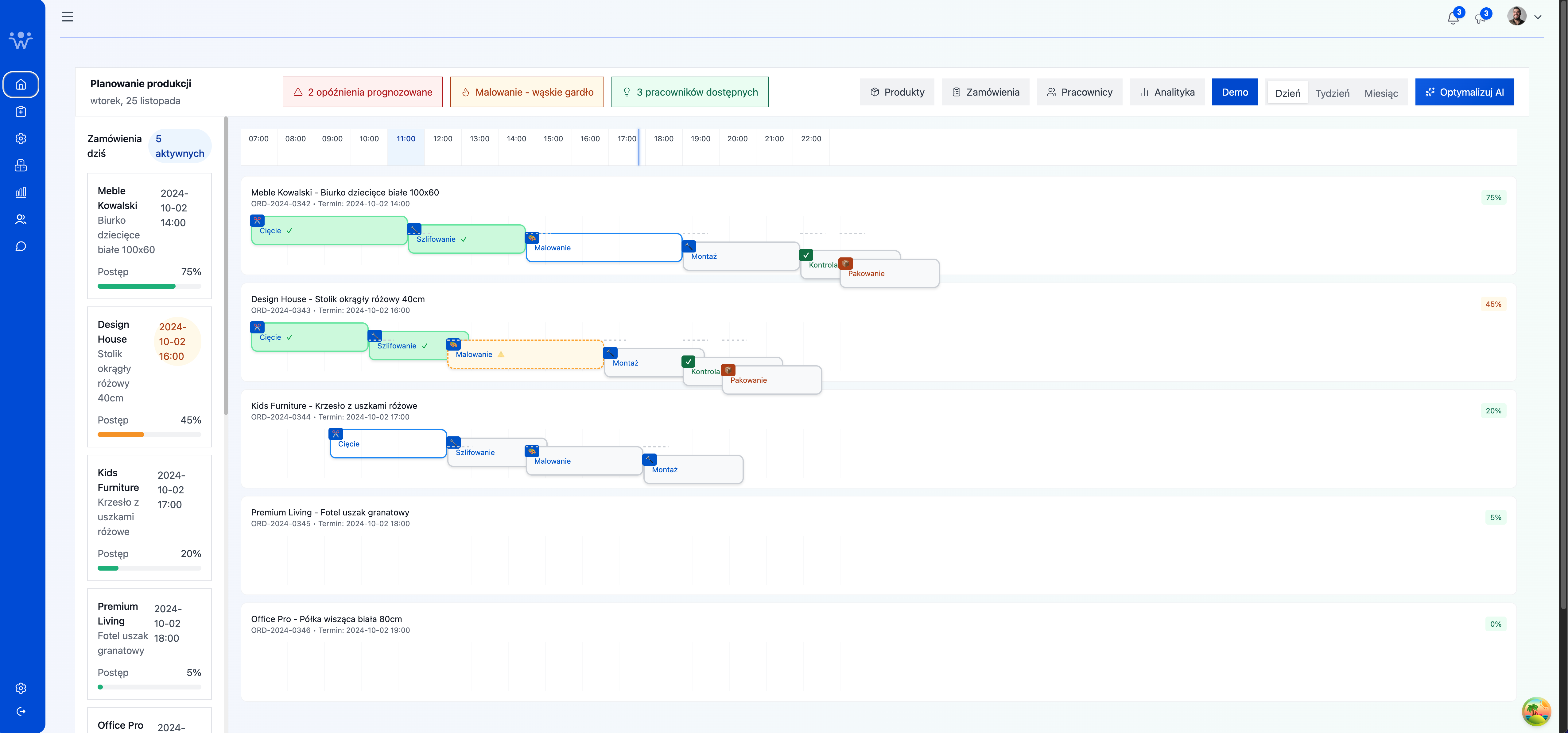 Ten widok przedstawia interaktywny harmonogram planowania produkcji, który pokazuje status zamówień, etapy realizacji oraz wykorzystanie zasobów w czasie. Użytkownik może szybko zidentyfikować opóźnienia, wąskie gardła i dostępność pracowników, co ułatwia podejmowanie decyzji operacyjnych.