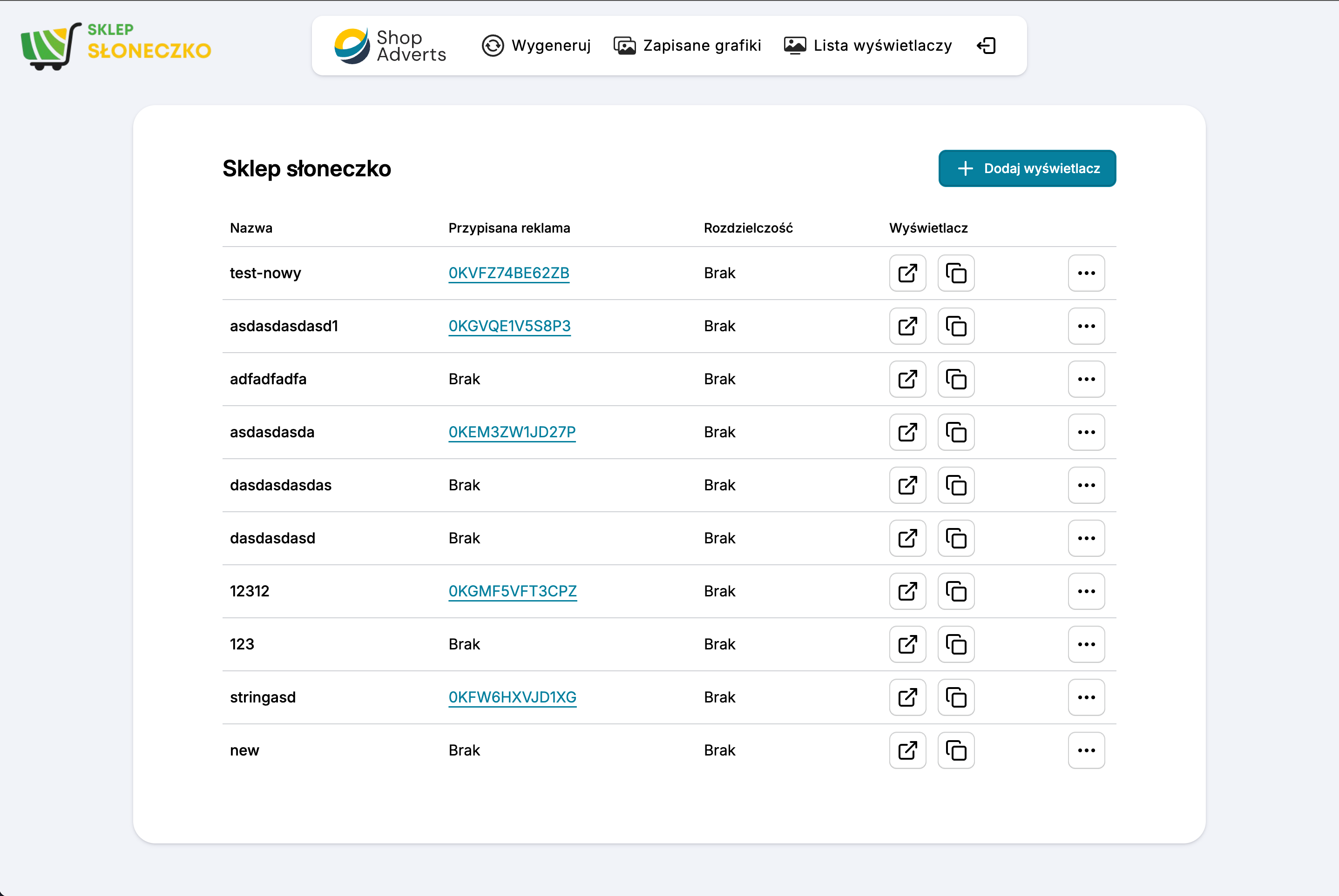 Overview of all active advertising displays in the store with information about assigned graphics, resolutions, and quick copy or edit capabilities for promotional materials.