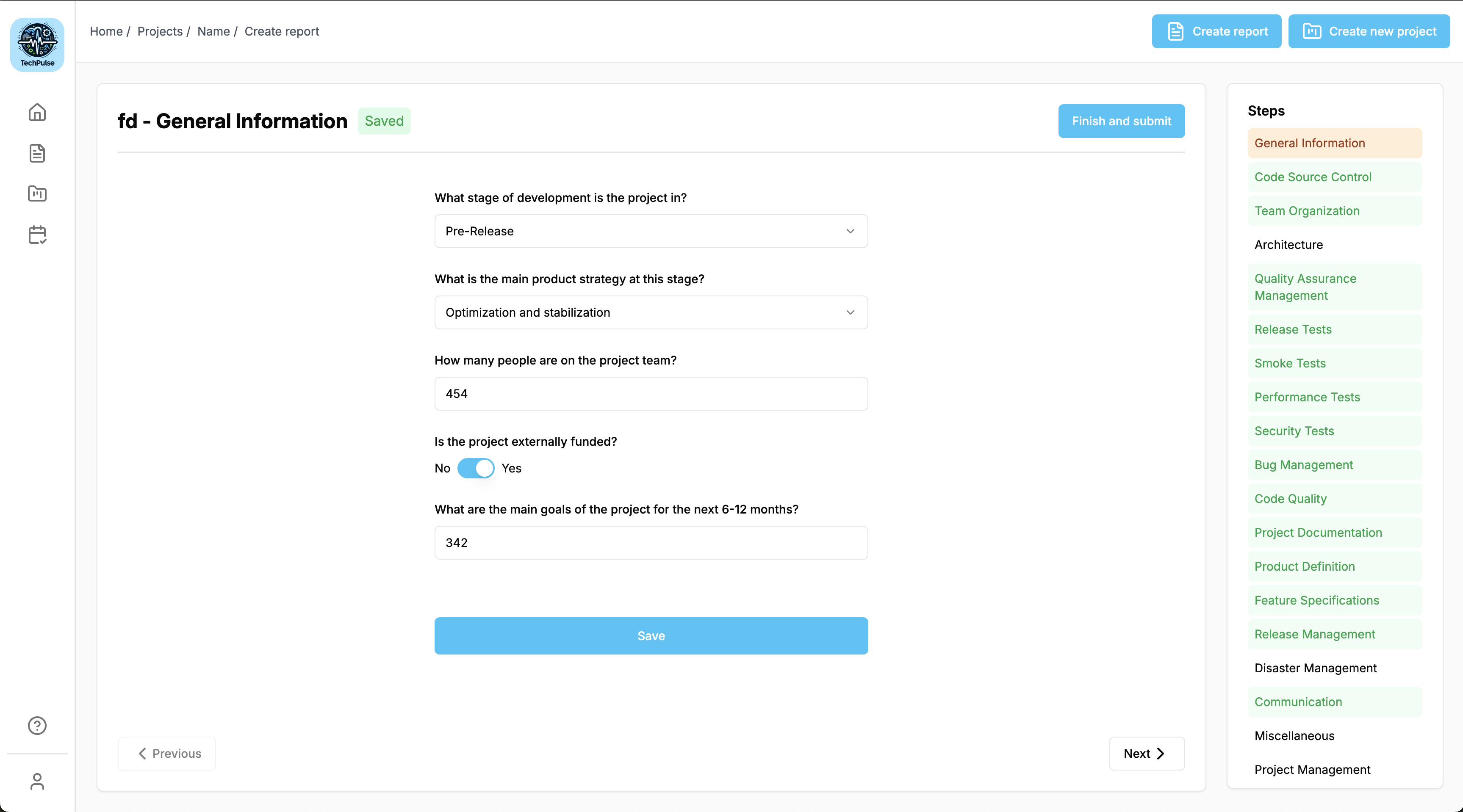 The application guides users through a multi-stage process of gathering information about a technology project, covering key areas such as system architecture, development team organization, code quality, security, project documentation, and release management. The system automatically analyzes collected data, generating detailed reports with assigned scores for each category and identifying potential technological risks. TechPulse offers flexible subscription plans tailored to the scale of investment activity, enabling analysis from several to unlimited projects. The platform excels in VC funds, private equity firms, startup accelerators, and among individual investors.